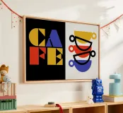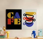 Questo poster combina una tipografia audace con tazze da caffè colorate e minimaliste. Perfetto per gli amanti del caffè e dell'arredamento contemporaneo.