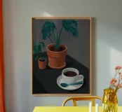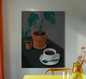 Una natura morta semplice e lunatica di una tazza di caffè nero accanto a una pianta di monstera in vaso. L'illuminazione scura e d'atmosfera crea una scena mattutina sofisticata, calma e contemplativa.