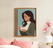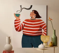 Una donna che tiene in mano una tazza di caffè caldo nella morbida luce del mattino. I toni delicati e le linee semplici ne fanno un'opera perfetta per le mattine lente e le routine tranquille.