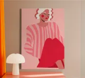 Una persona con una camicia a righe bianche e rosse seduta su uno sfondo rosa.
