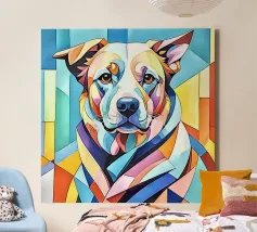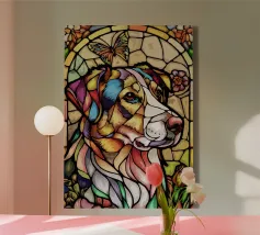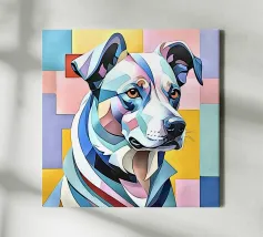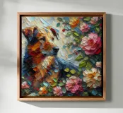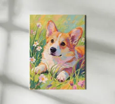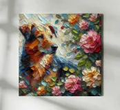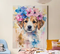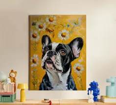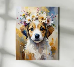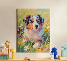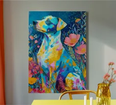 Canvas artistico raffigurante un cane pittorico immerso in un vibrante paesaggio floreale, ideale per decorare il soggiorno o lo studio. Stampa di alta qualità su tela resistente, perfetta per gli amanti degli animali e dell'arte contemporanea, senza possibilità di personalizzazione. Prodotto con materiali certificati e cura artigianale europea.