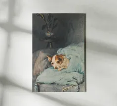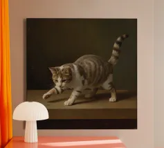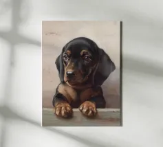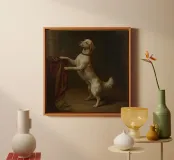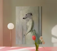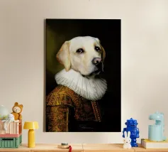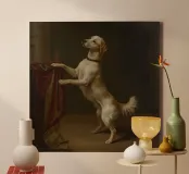 Cane in piedi con le zampe su un tavolo in un ambiente classico tela
