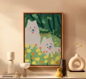 cani animali domestici pelliccia soffice verde fiori scena all'aperto cani sorridenti erba espressioni carine compagnia animale natura giardino canino umore felice paesaggio bosco fiori selvatici prato flora in fiore scena colorata
