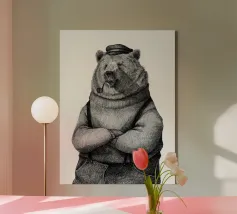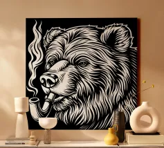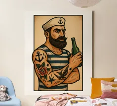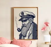 Poster del capitano in stile linoleografico con un marinaio barbuto che fuma la pipa. Un'audace arte da parete nautica in bianco e nero dal fascino vintage, perfetta per gli interni costieri, gli appassionati di mare e l'arredamento unico della casa.