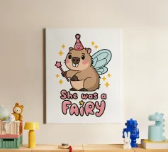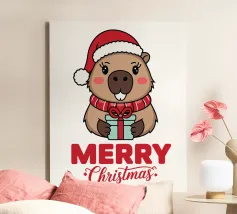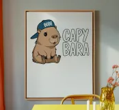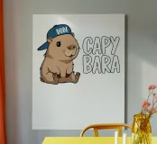 Un simpatico capibara che indossa un berretto blu con la scritta "Dude" si trova accanto a un testo grande e scherzoso che recita "CAPYBARA".