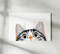 Un gatto meme che sbircia dal bordo di un bancone con grandi occhi spalancati