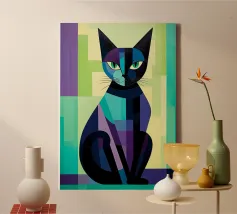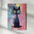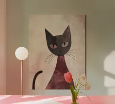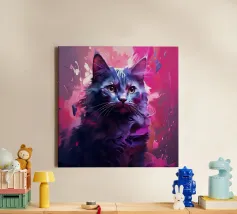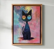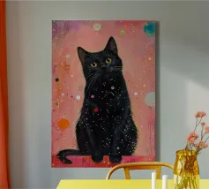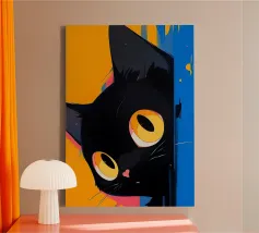 cat whiskers big eyes abstract background colorful splatter effect wet paint look feline tail ears cute cartoon whimsical playful vivid colors gradient animal artistic contrast fantasy theme