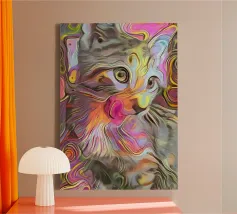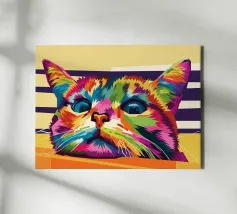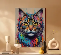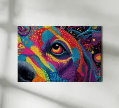 A striking, high-energy portrait that transforms a familiar subject into a vivid explosion of colour and pattern. Intense, luminous eyes anchor the composition, drawing the viewer into a world of layered brushwork, graphic symbols, and expressive marks. The close-up framing amplifies presence and emotion, while the saturated palette gives the image a bold, contemporary edge.