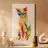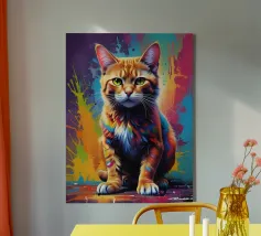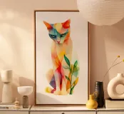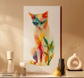 Una vivace illustrazione geometrica di un gatto seduto con forme sovrapposte dai colori dinamici, abbinata a elementi astratti a forma di foglia per un design moderno e creativo.