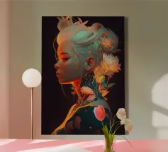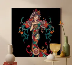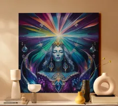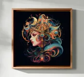 Uno squisito ritratto fantasy che unisce eleganza regale e simbolismo cosmico. La Sovrana Celeste raffigura una potente figura femminile adornata con un copricapo dorato e ornato da motivi lunari e celestiali. Nastri fluenti di turchese, oro e cremisi si intrecciano intorno a lei, creando un'aura radiosa di misticismo e forza. Una celebrazione della femminilità divina, dello stile art nouveau e dell'intricato artigianato digitale.