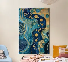 Un'ipnotica opera d'arte astratta caratterizzata da vorticose e vibranti tonalità di blu, verde e oro. Le linee e i motivi intricati evocano un senso di profondità cosmica e di bellezza eterea. Questo pezzo è perfetto per aggiungere un tocco di eleganza e raffinatezza a qualsiasi spazio.