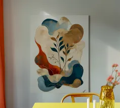Un'accattivante opera d'arte astratta che fonde elementi organici e geometrici. Il fogliame rigoglioso si intreccia con corpi celesti e forme architettoniche, creando un senso di armonia ed equilibrio. La tavolozza di colori tenui e i dettagli intricati invitano alla contemplazione e all'esplorazione.
