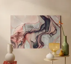 Un'opera d'arte astratta dinamica con forme vorticose nei toni del blu, del rosa, del nero e del bianco, che ricorda un fiume celeste che scorre, una nebulosa cosmica o una superficie liquida marmorizzata con un senso di movimento e profondità.
