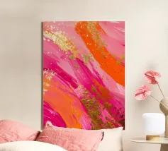 This vibrant abstract painting features a dazzling interplay of reds, purples, and gold, evoking a sense of cosmic energy and celestial beauty.