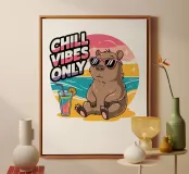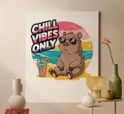 Un capibara rilassato con gli occhiali da sole si sdraia su una spiaggia con un drink tropicale e un vibrante tramonto sullo sfondo. La frase "Chill Vibes Only" è ben visibile accanto al capibara.
