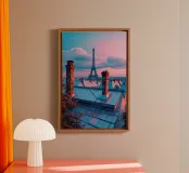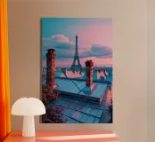 Una composizione mozzafiato che mostra la Torre Eiffel da un intimo punto di osservazione sul tetto. Il caldo bagliore dorato del tramonto proietta una luce magica sui camini e sui tetti, accentuandone la struttura rustica. Questa immagine racchiude l'essenza delle serate parigine, dove i punti di riferimento iconici incontrano gli elementi urbani quotidiani in perfetta armonia. Le serene tonalità pastello del cielo aggiungono una qualità sognante, rendendo questa immagine la quintessenza di Parigi come città del romanticismo e della bellezza senza tempo.