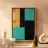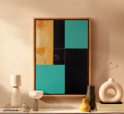 Quadro astratto in stile minimalista con tre aree di colore: Blu turchese in basso a sinistra e in alto a destra, nero al centro e un accento dorato in mezzo. Linee chiare, colori armoniosi e forme geometriche sottolineano l'eleganza e la semplicità.