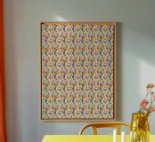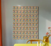 Un motivo vivace e colorato presenta una varietà di forme in rosso, blu, arancione e verde. Ripetuto in modo simmetrico, il disegno crea un ritmo visivo accattivante.