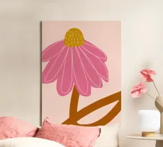 Ravvivate il vostro spazio con questa vibrante illustrazione di crisantemo, che mostra strati di petali smerlati rosa che si irradiano da un allegro centro giallo. Incorniciato da foglie verde scuro, il fiore si staglia su un morbido sfondo verde pastello, creando un design armonioso ed edificante. Quest'opera d'arte emana un fascino botanico moderno e senza tempo, perfetto per gli amanti della natura e dei fiori.
