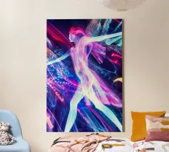 "Una bellissima diva di un iconico dipinto neoclassico viene reimmaginata attraverso il collage digitale, cambiando completamente il suo contesto originale. L'opera d'arte cattura l'emozione della sua espressione in un ambiente probabilmente con musica ad alto volume, dove la protagonista è completamente immersa per sfuggire ai suoi problemi e alle sue preoccupazioni. Questa reinterpretazione invita lo spettatore a identificarsi con l'esperienza di disconnessione e di liberazione che la musica può offrire".