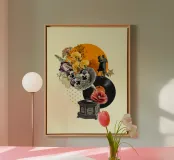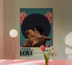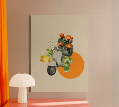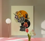 A nostalgic collage art print blending vintage charm with romantic whimsy. An ornate gramophone bursts with vibrant flowers and vinyl records, while a dancing couple captures the magic of timeless music. Perfect wall art for music lovers, retro decor fans, or anyone drawn to sentimental storytelling through design.