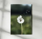 Un delicato dente di leone con uno sfondo morbido e sfocato, i cui piccoli semi si muovono con grazia nell'aria.
