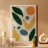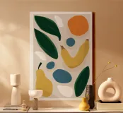 This abstract artwork deconstructs fruits like pears and oranges into their basic organic shapes and colors. The overlapping forms in a palette of ochre, blue, and green create a modern and sophisticated composition that is a subtle nod to a classic still life.