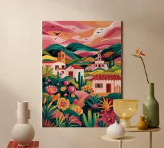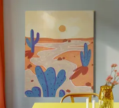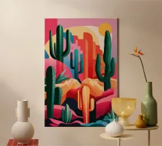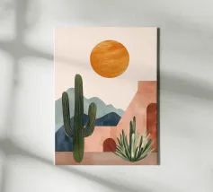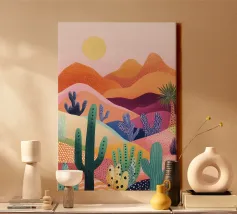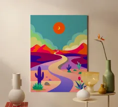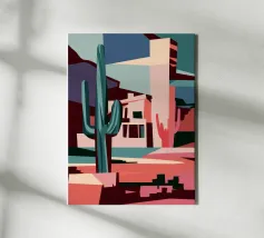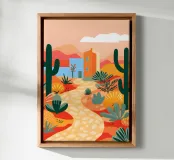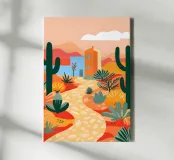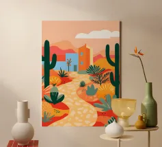 Un paesaggio desertico è caratterizzato da un sentiero tortuoso che conduce a una piccola casa, circondata da cactus e varie piante del deserto. I toni caldi dell'arancione e del rosa riempiono il cielo e lo sfondo, dando l'impressione di un tramonto sereno.