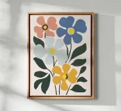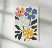 Portate un fresco fascino retrò nella vostra casa! Questo design floreale combina forme minimaliste e colori vivaci: fiori blu, arancioni, gialli e verde pastello su foglie eleganti e scure. L'estetica moderna incontra un'atmosfera di metà secolo senza tempo e dona a soggiorni, camere da letto o uffici quel qualcosa in più. Ideale come murale, cuscino, cover per cellulare o tazza - perfetto per gli amanti dei fiori e per gli appassionati di arte retrò, design boho e decorazioni scandinave. Questo motivo ispira con i suoi colori vivaci e il suo motivo floreale senza tempo.
