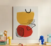 Una moderna composizione astratta caratterizzata da audaci forme organiche in rosso e giallo, accentuate da texture nere e linee grafiche scarabocchiate, che creano un pezzo equilibrato e sofisticato.