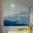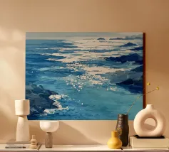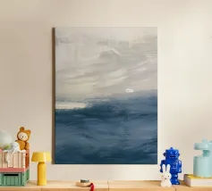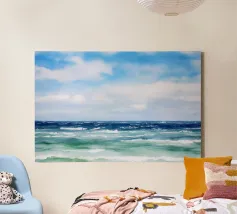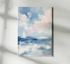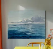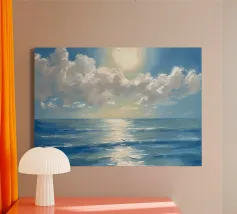 Con morbide nuvole che fluttuano su un oceano vasto e indisturbato, questo dipinto evoca la quiete dell'acqua aperta. Sottili variazioni di blu rivelano profondità e distanza, invitando lo spettatore a respirare con la marea.