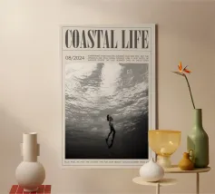 Questo poster minimalista subacqueo cattura un momento di assoluta calma e controllo. Un apneista solitario scende verticalmente attraverso forme stratificate e tonalità oceaniche tenui, simboleggiando concentrazione, disciplina e fiducia nel proprio respiro. Le sovrapposizioni geometriche aggiungono un tocco moderno e astratto, mentre i blu profondi e i toni neutri sabbia creano un senso di profondità e quiete. Perfetto per gli amanti dell'apnea, del surf, degli sport oceanici o per chiunque sia attratto da immagini calme e introspettive.