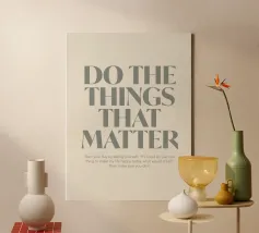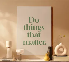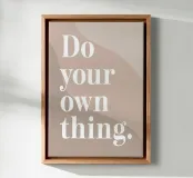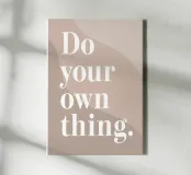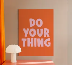 Una composizione vibrante ed edificante con una persona che cammina con sicurezza lungo un sentiero tortuoso e colorato che si separa da una strada trafficata e uniforme. La frase "Do Your Own Thing" (Fai la tua cosa) è stilizzata in una tipografia audace e dipinta a mano, circondata da spruzzi di colore. Le opere d'arte emanano individualità, libertà e autoespressione.