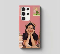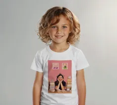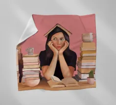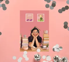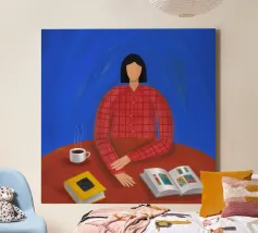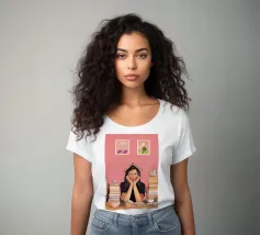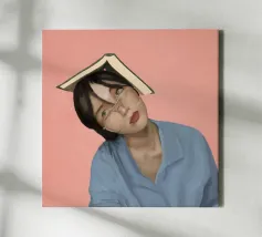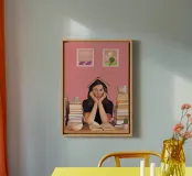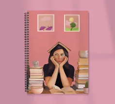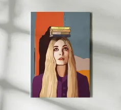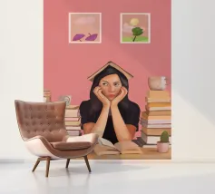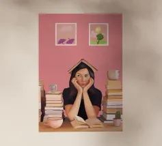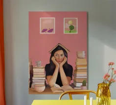 Un ritratto moderno e stravagante di una donna persa nei suoi pensieri, circondata da alte pile di libri e calde tazze di caffè, con un libro appollaiato giocosamente in cima alla testa. Su uno sfondo rosa tenue con allegre stampe incorniciate, questo pezzo cattura l'essenza del sogno a occhi aperti, della fatica dello studio e del delicato equilibrio tra procrastinazione e produttività. Ideale per gli amanti dei libri, per gli spazi accoglienti e per tutti coloro che trovano la magia nei momenti intermedi.