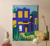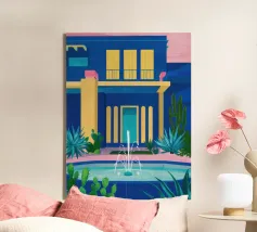 Illustrazione di un moderno edificio blu e giallo di notte, circondato da piante rigogliose. La composizione è fresca e d'atmosfera, con un'atmosfera elegante, contemporanea e urbana.