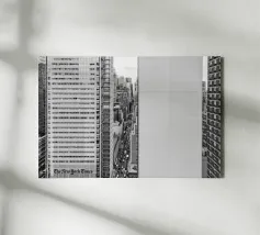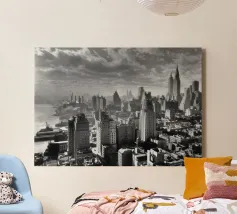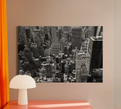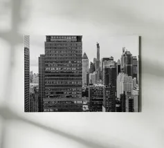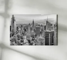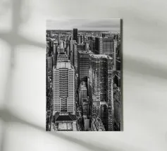 La splendida fotografia in bianco e nero cattura lo skyline di Manhattan, mostrando gli imponenti grattacieli e le loro eleganti facciate in una composizione geometrica da una prospettiva aerea. Con riflessi visibili alla luce del giorno, questo poster di lusso incarna l'arte moderna ed è un'aggiunta elegante agli interni contemporanei.