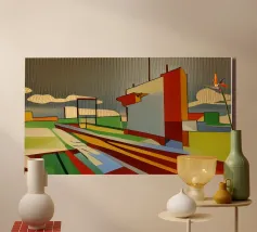 A view from an elevated train or platform shows a colorful, stylized urban landscape with bold geometric shapes and a strong sense of structure and movement.
