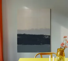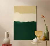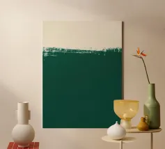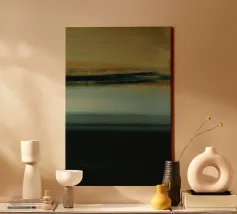 Una composizione astratta contemporanea costruita attorno a una linea dell'orizzonte grezza ed espressiva. Il verde bosco intenso fissa la metà inferiore, mentre i toni morbidi del beige nella parte superiore creano leggerezza e spazio visivo. La transizione strutturata tra i due campi introduce un movimento sottile e una profondità pittorica, conferendo all'opera un carattere raffinato ma organico. Minimale nella struttura, ma ricca di dettagli superficiali, quest'opera d'arte evoca il paesaggio, la quiete e la calma introspezione.
