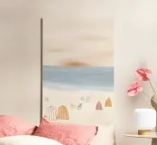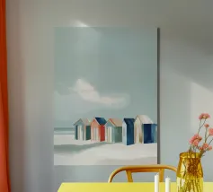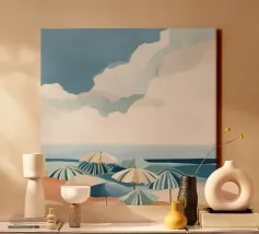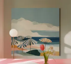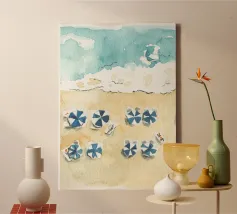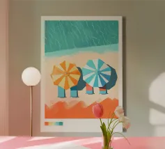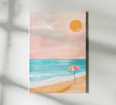 Un'illustrazione serena di una spiaggia tranquilla, immersa in toni caldi. Cappelli da sole appoggiati sulla sabbia e capanne rustiche completano la scena di pace, catturando l'essenza delle lente giornate estive.