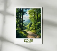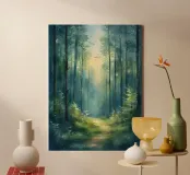 Un sereno dipinto ad acquerello di un sentiero illuminato dal sole che si snoda attraverso una foresta verde e rigogliosa.