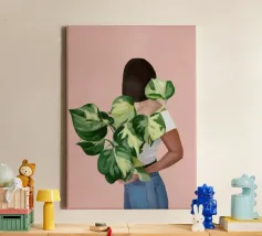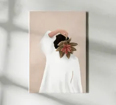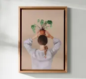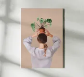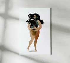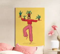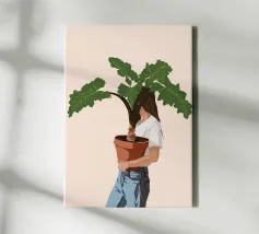 Un ritratto affascinante e dai toni tenui di una donna che tiene in equilibrio una pianta in vaso sulla testa, vista da dietro. Con la sua treccia infilata sotto un maglione accogliente e su uno sfondo neutro e caldo, questa illustrazione celebra l'armonia, la consapevolezza e un tocco di estrosità quotidiana. Un'opera d'arte da parete perfetta per gli amanti delle piante, per gli spazi dedicati allo yoga o per gli interni calmi e creativi.