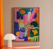 Una composizione astratta vivace e giocosa, caratterizzata da una serie di forme organiche simili a blob in blu, rosa e giallo. Le forme spontanee e i colori energici creano un senso di gioiosa espressione artistica.