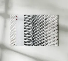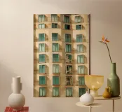 Modelli urbani a Berlino-Mitte: La moderna facciata dell'edificio si presenta come un disegno geometrico di vetro e pietra. Le finestre, disposte in modo uniforme, riflettono la luce del giorno, mentre le dolci onde della struttura dell'edificio spezzano il ritmo rigoroso. Le sottili tracce del tempo e delle intemperie conferiscono all'architettura chiara una sottile vivacità: un gioco tra ordine e cambiamento organico.