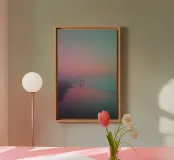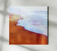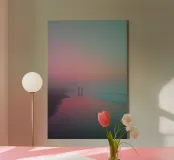 Due figure camminano silenziosamente lungo un litorale avvolto dalla nebbia, dove le tonalità del rosa polveroso e del verde mare si fondono l'una nell'altra. Le loro sagome speculari si increspano dolcemente sulla sabbia bagnata, fondendosi nella calma distesa di luce sfumata. Quest'opera d'arte evoca la bellezza effimera dei percorsi condivisi, brevi, tranquilli ed eterni. Uno studio sul colore, la connessione e l'atmosfera, reso in una calma meditativa.