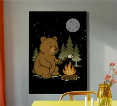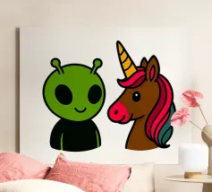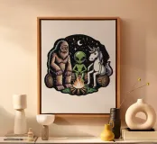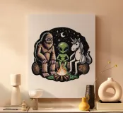 Uno yeti, un alieno e un unicorno sono riuniti intorno a un falò sotto un cielo stellato. Questa scena stravagante combina elementi fantasy e spaziali in un ambiente amichevole.