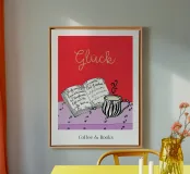 Gemütliche Illustration eines Buches und einer dampfenden Tasse auf einem Tisch mit Blümchentischdecke. Im Buch steht: The sky was grey beyond the window, but the thoughts were light and the coffee kind in its warmth. Out of nowhere... Über allem der große Schriftzug "Glück". Tischdecke altrosa, Hintergrund knallig rot, Schriftzug gelbbeige. Darunter der Schriftzug Coffee & Books.