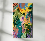 Una composizione astratta alta e stretta, piena di forme e motivi di foglie colorate sovrapposte, che suggerisce una fetta vibrante di una fitta giungla verticale.