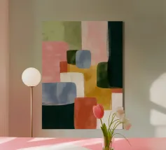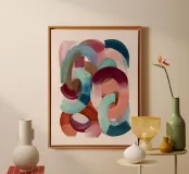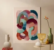 Le forme curvilinee dei pennelli nei colori verde acqua, ruggine e blush si fondono in un movimento ritmico. Un pezzo audace e rilassante che incarna il flusso creativo.