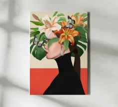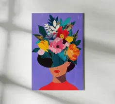 Collage disegnato e dipinto basato sulla propria fotografia. Ritratto di donna disegnato a mano e in digitale, con la testa ricoperta di farfalle e fiori. Un'esplosione di colori su uno sfondo tranquillo. Tutti i lavori di Good Blue sono realizzati senza l'uso di AI.