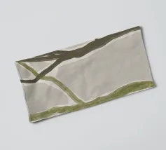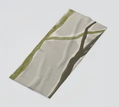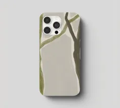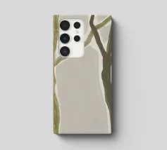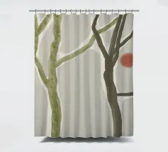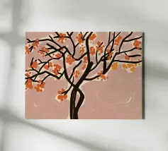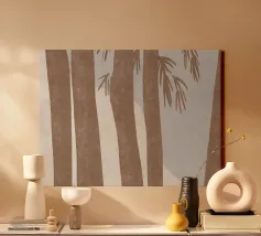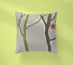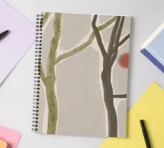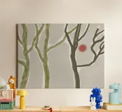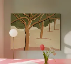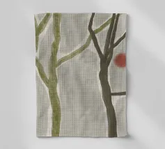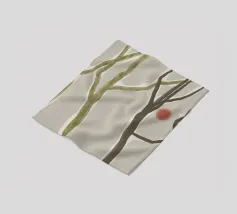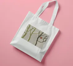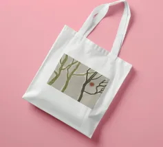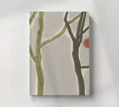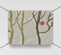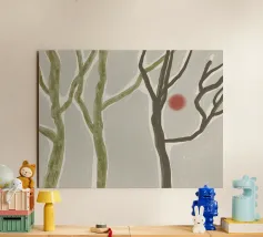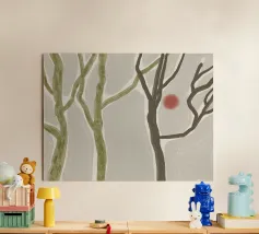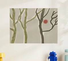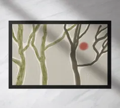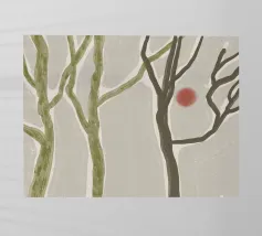 I tronchi nudi degli alberi sono raffigurati con rami che si intrecciano, su uno sfondo neutro. Un punto rosso solitario aggiunge un tocco di colore tra i toni monocromatici degli alberi.